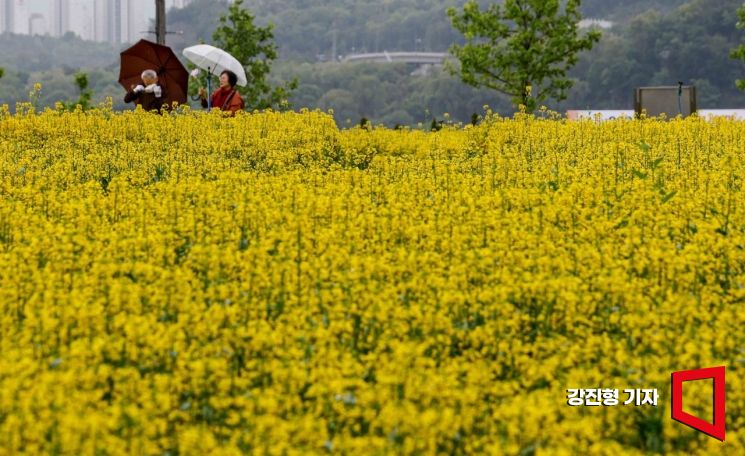 전국 대부분 지역에 비가 내리고 있는 9일 경기 경기 구리한강시민공원에서 열린 '구리 유채꽃 축제'를 찾은 시민이 유채꽃을 배경으로 사진촬영을 하고 있다.