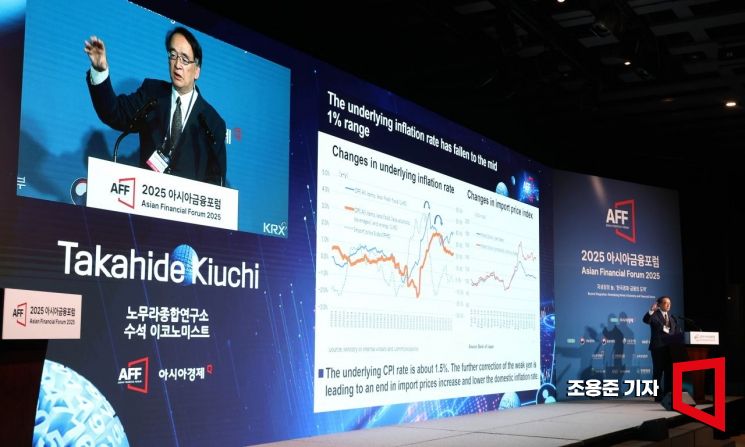 기우치 다카히데 노무라종합연구소 수석 이코노미스트가 21일 서울 중구 웨스턴조선호텔에서 열린 '2025 아시아금융포럼(Asisn Financial Forum 2025)'에 참석, '트럼프 관세와 세계 및 일본경제' 란 주제로 기조연설을 하고 있다.