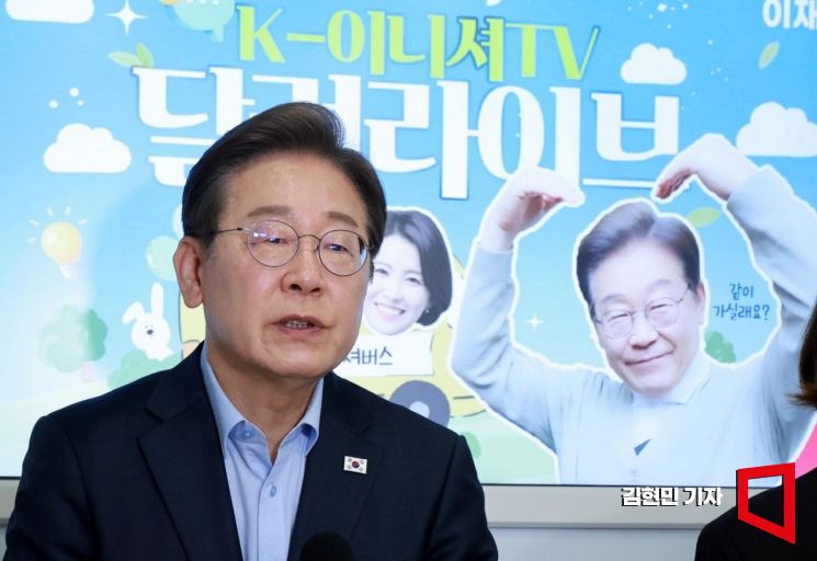 이재명 더불어민주당 대선 후보가 21일 인천 미추홀구 문학경기장에서 ‘K이니셔TV - 달려라이브' 진행을 마친 뒤 기자브리핑을 하고 있다.