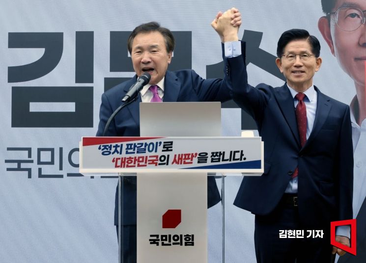 손학규 바른미래당 대표가 22일 서울 여의도 국민의힘 중앙당사에서 열린 정치개혁 관련 긴급 기자회견에서 김문수 국민의힘 대선 후보의 손을 들어올리며 지지 선언을 하고 있다.
