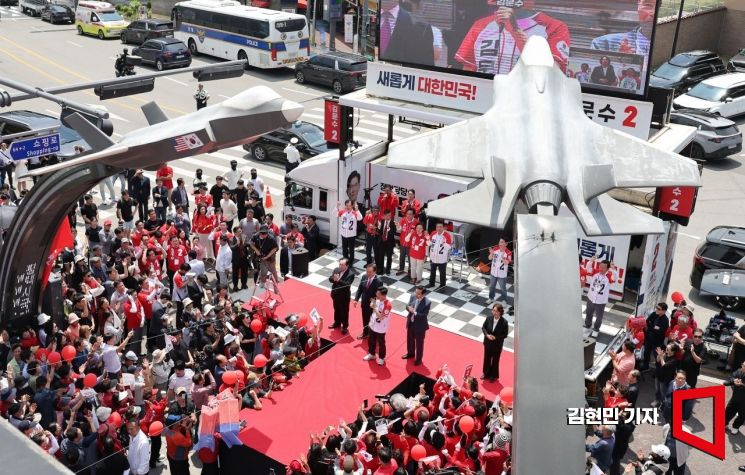 김문수 국민의힘 대선 후보가 26일 경기 평택시 K-55미군기지 정문 앞에서 유세를 하고 있다.