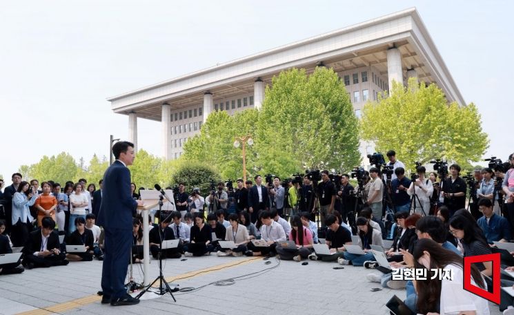 이준석 개혁신당 대선 후보가 27일 국회 소통관 앞에서 긴급 기자회견을 하고 있다.