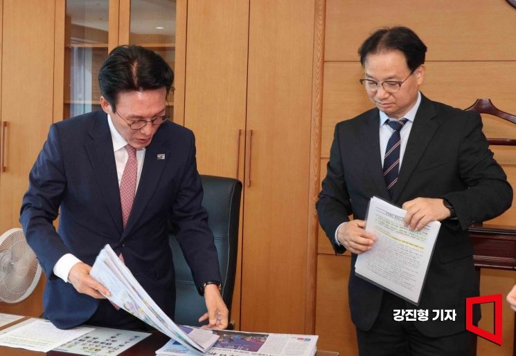 김민석 국무총리 후보자가 5일 서울 종로구 금융감독원 연수원에 마련된 인사청문 사무실에 출근해 신문 및 업무 자료 등을 살펴보고 있다.