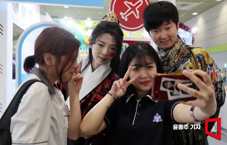 5일 서울 강남구 코엑스에서 열린 서울국제관광전을 찾은 관람객들이 중국전통복장을 한 모델들과 사진을 찍으며 즐거운 시간을 보내고 있다.