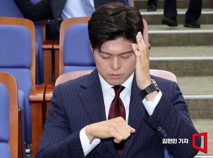 김용태 국민의힘 비상대책위원장이 9일 국회에서 열린 의원총회에 참석하고 있다.