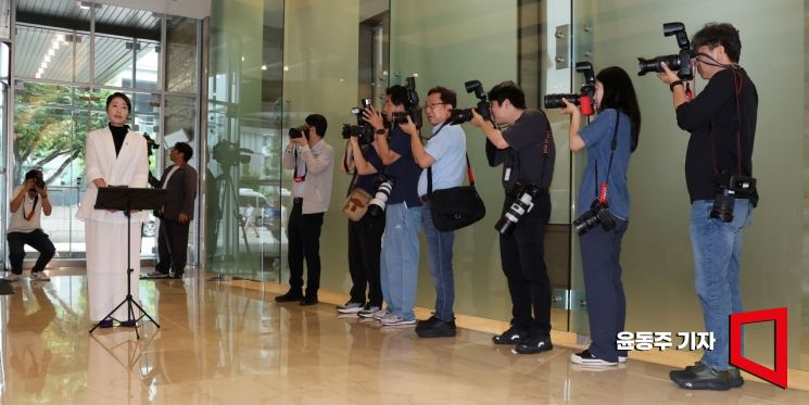 강선우 여성가족부 장관 후보자가 26일 인사청문회 준비를 위해 서울 종로구 이마빌딩에 마련된 청문회 준비 사무실로 출근, 취재진에게 소감을 밝히고 있다.