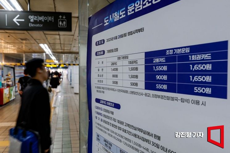 서울 지하철 요금이 내일부터 150원 인상을 앞두고 있는 27일 서울 중구 지하철2호선 을지로입구역에 도시철도 운임조정 안내문이 붙어 있다.