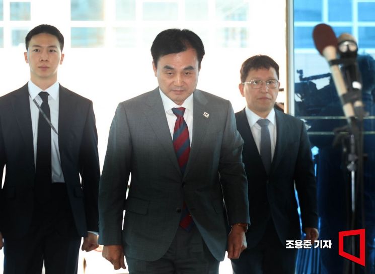 안규백 국방부 장관 후보자가 27일 서울 용산구 육군회관에 마련된 인사청문회 준비사무실로 첫 출근하며 인사하고 있다.