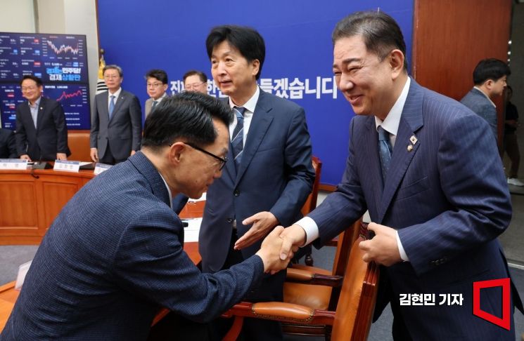 김병기 더불어민주당 당대표 직무대행 겸 원내대표가 30일 국회에서 열린 상법 개정안 추진 관련 경제6단체 부회장단 간담회를 찾아 참석자들과 인사하고 있다. 이번 간담회에는 박일준 대한상공회의소 상근부회장, 김창범 한국경제인협회 상근부회장, 이동근 한국경영자총협회 상근부회장, 장석민 한국무역협회 전무, 오기웅 중소기업중앙회 상근부회장, 이호준 한국중견기업연합회 상근부회장, 정우영 한국상장사협회 부회장 등이 참석했다.