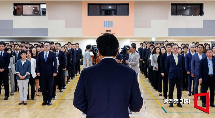 정진우 신임 서울중앙지검장이 4일 서울 서초구 서울중앙지검에서 열린 취임식에 참석해 취임사 하고 있다.