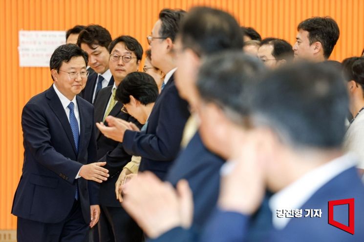 정진우 신임 서울중앙지검장이 4일 서울 서초구 서울중앙지검에서 열린 취임식을 마친 뒤 직원들과 인사하고 있다.