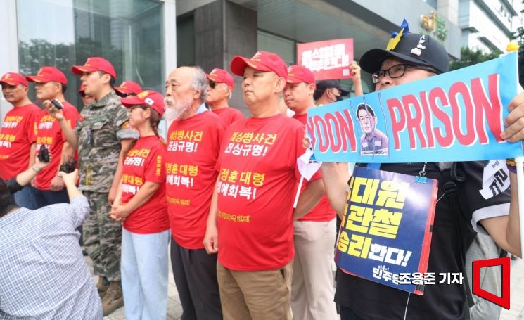 김계환 전 해병대 사령관이 순직해병 특검에 출석한 7일 서울 서초구 특검 사무실 앞에서 해병대예비역연대 회원들이 사건 진상 규명 촉구 기자회견을 하고 있다.