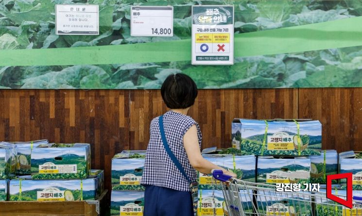 이달 초부터 시작된 때 이른 무더위로 농산물값이 오르는 '히트플레이션' 현상이 나타나며 최근 일주일 새 수박 한 통이 3만원을 넘어서고, 특히 배추나 시금치 같은 더위에 약한 채소 가격이 상승한 가운데 14일 서울 서초구 하나로마트 양재점을 찾은 고객이 배추 가격을 보고 있다.