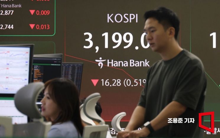 코스피지수가 하루만에 3,200선이 무너진 16일 서울 중구 하나은행 딜링룸 모니터에 코스피를 비롯해 원/환율, 코스닥 지수가 표시돼 있다. 이날 코스피는 전 거래일 대비 0.24% 내린 3207.48에 코스닥지수도 0.34% 내린 810.09로 시작해 하락폭을 키우고 있다.