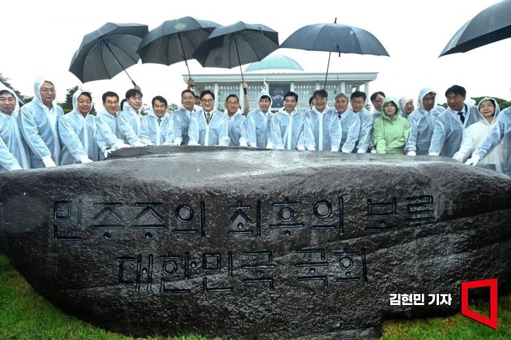 17일 국회 잔디광장에서 열린 국회 상징석 제막식에서 우원식 국회의장 등 참석자들이 기념촬영을 하고 있다. 상징석에는 국회가 민주주의의 보루로서 ‘12·3 비상계엄’ 해제를 이끌었다는 내용의 문구가 새겨져 있다.