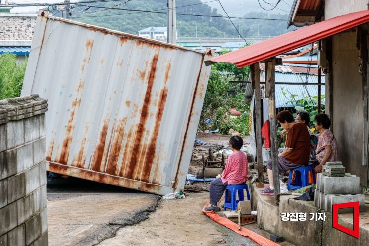 집중호우로 가평군 일대가 큰 피해를 입은 가운데 21일 경기 가평군 상면 조종천에 인접한 대보1리 마을 입구에 급류로 떠내려온 컨테이너가 길목을 막고 있다.