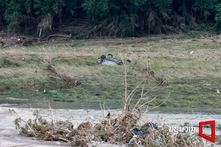 집중호우로 가평군 일대가 큰 피해를 입은 가운데 21일 경기 가평군 조종천변에 급류에 휩쓸린 차량이 전복돼 있다.