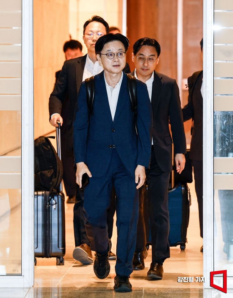 김정관 산업통상자원부 장관이 대미 관세 고위급 회담에 참석하기 위해 23일 인천국제공항 제2여객터미널에서 출국 하고 있다.