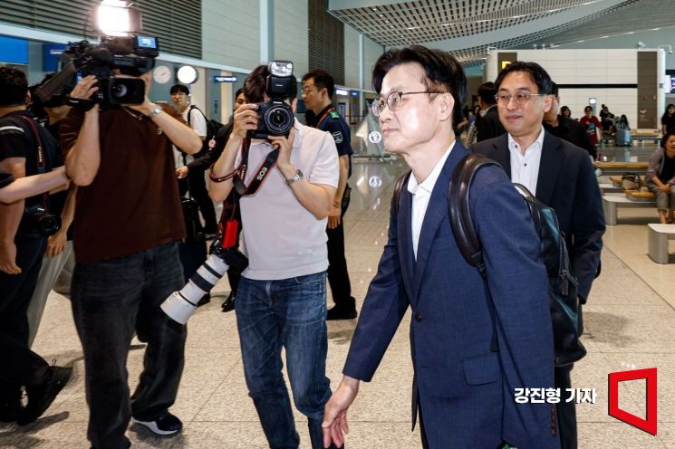 김정관 산업통상자원부 장관이 대미 관세 고위급 회담에 참석하기 위해 23일 인천국제공항 제2여객터미널에서 출국 하고 있다.