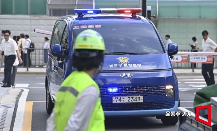 구속 중인 이일준 삼부토건 회장이 탑승한 것으로 추정되는 법무부 호송차량이 23일 서울 종로구 kt광화문빌딩 웨스트에 마련된 김건희특검 건물로 들어가고 있다.