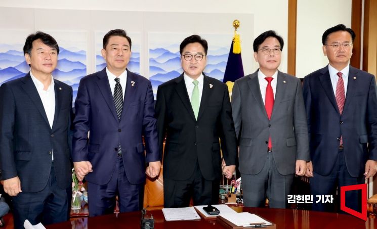 문진석 더불어민주당 원내수석부대표, 김병기 원내대표, 우원식 국회의장, 송언석 국민의힘 원내대표, 유상범 원내수석부대표(왼쪽부터)가 23일 국회의장실에서 회동을 갖고 기념촬영을 하고 있다.