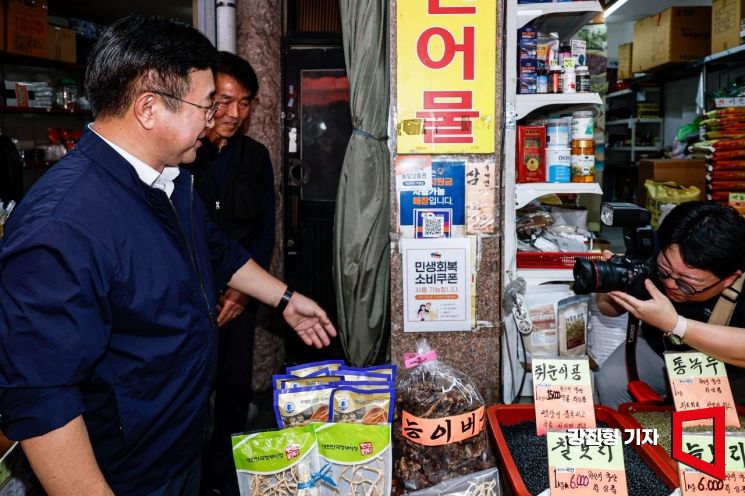 윤호중 행정안전부 장관이 24일 서울 금천구 비단길현대시장 시흥건어물을 찾아 민생회복 소비쿠폰 사용 현장을 점검하고 있다.