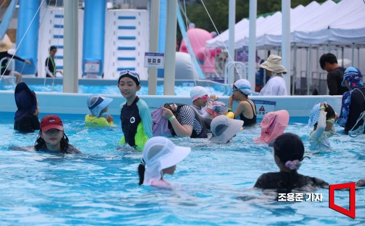 폭염이 기승을 부리며 서울 낮 최고기온이 영상 36도를 기록한 25일 서울 광화문에 마련된 '2025 서울 썸머비치 수영장'에서 아이들이 물놀이를 하며 더위를 식히고 있다.