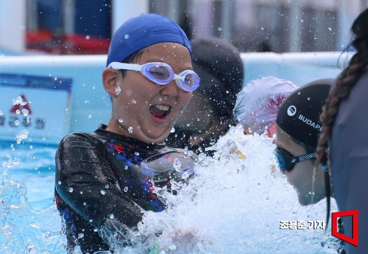 폭염이 기승을 부리며 서울 낮 최고기온이 영상 36도를 기록한 25일 서울 광화문에 마련된 '2025 서울 썸머비치 수영장'에서 아이들이 물놀이를 하며 더위를 식히고 있다.