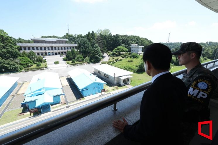 정동영 신임 통일부 장관이 25일 취임식을 앞두고 판문점 자유의 집에서 북쪽 판문각을 살펴보고 있다. [통일부제공]