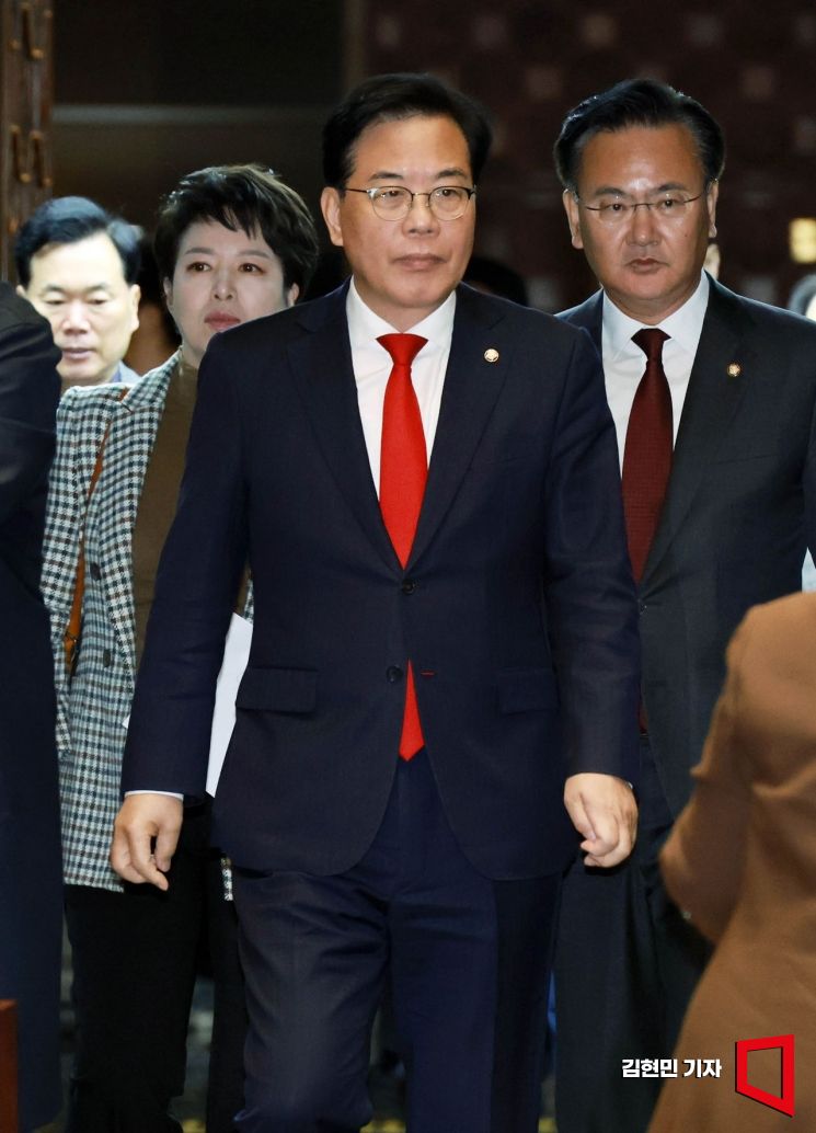 송언석 국민의힘 원내대표가 27일 국회에서 열린 의원총회에 참석하고 있다.