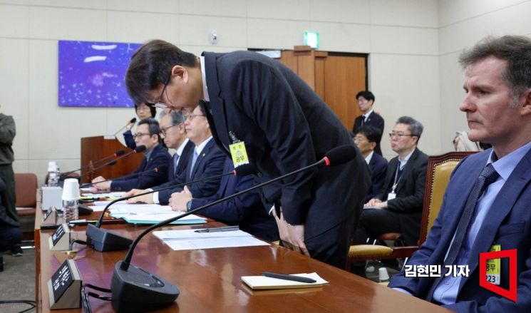박대준 쿠팡 대표가 2일 국회 과학기술정보방송통신위원회 전체회의에서 열린 현안질의에 참석해 허리 숙여 사고하고 있다.