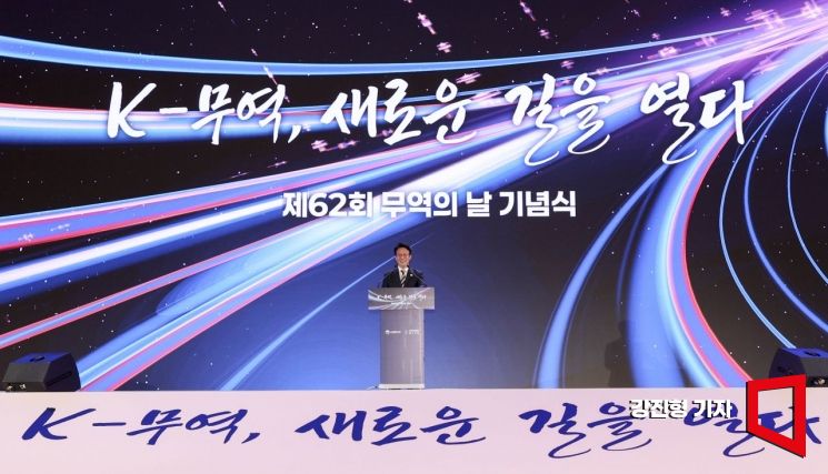 김민석 국무총리가 4일 서울 강남구 코엑스에서 열린 '제62회 무역의 날 기념식'에 참석해 기념사하고 있다.