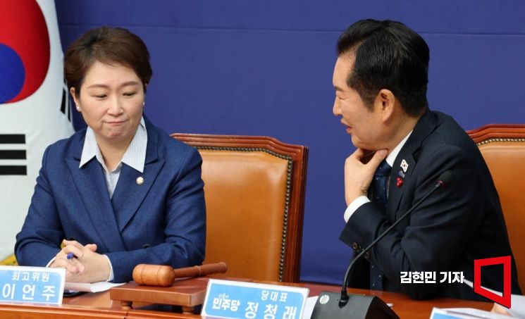 정청래 더불어민주당 대표와 이언주 최고위원이 5일 국회에서 열린 최고위원회의에서 대화하고 있다.