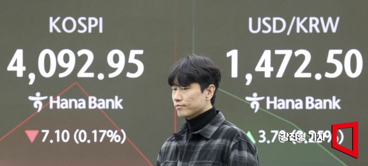 코스피 지수가 전 거래일 대비 9.2포인트 상승한 4109.25로 개장한 8일 서울 중구 하나은행 본점 딜링룸 전광판에 국내 증시 지수가 표시돼 있다.