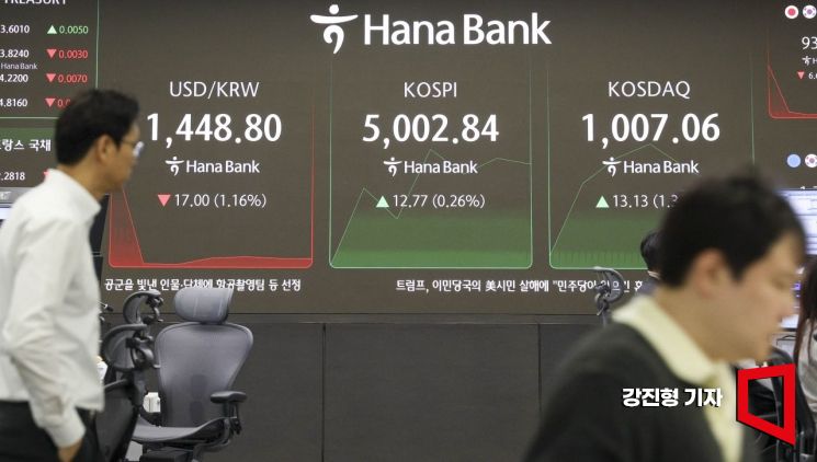 코스피 지수가 전 거래일 대비 7.47포인트 상승한 4997.54에 개장한 26일 서울 중구 하나은행 본점 딜링룸에서 딜러들이 업무를 보고 있다. 이날 코스닥은 4년만에 1000선을 돌파했으며, 원달러 환율은 전 거래일 대비 19.7원 하락한 1446.1원에 거래를 시작 했다.