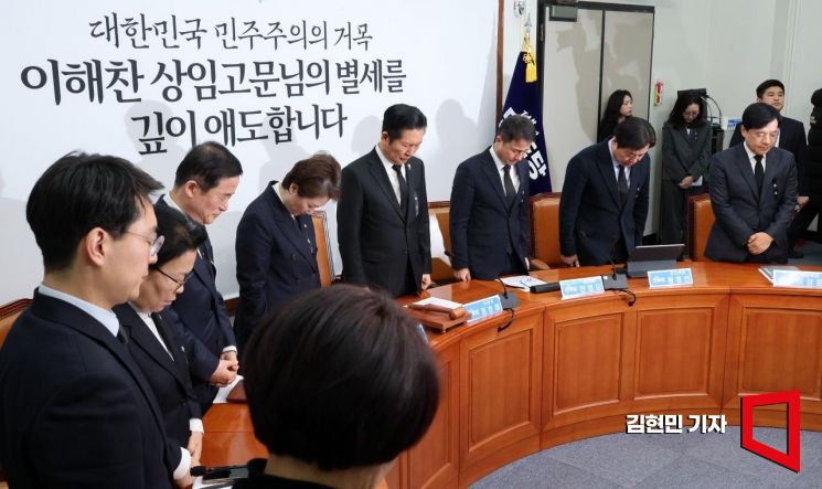 정청래 대표와 한병도 원내대표를 비롯한 더불어민주당 지도부가 26일 국회에서 열린 최고위원회의에서 이해찬 전 국무총리의 별세를 애도하며 묵념하고 있다.