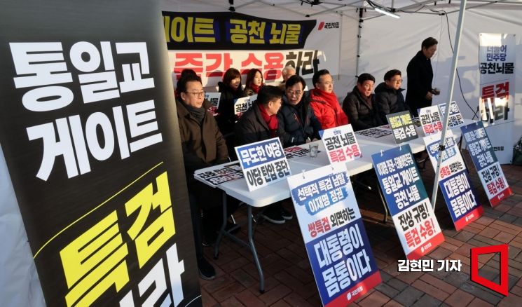 송언석 국민의힘 원내대표를 비롯한 의원들이 27일 국회 본청 앞에서 '더불어민주당 공천뇌물-통일교 게이트 특검 촉구 국회 천막 농성'을 하고 있다.