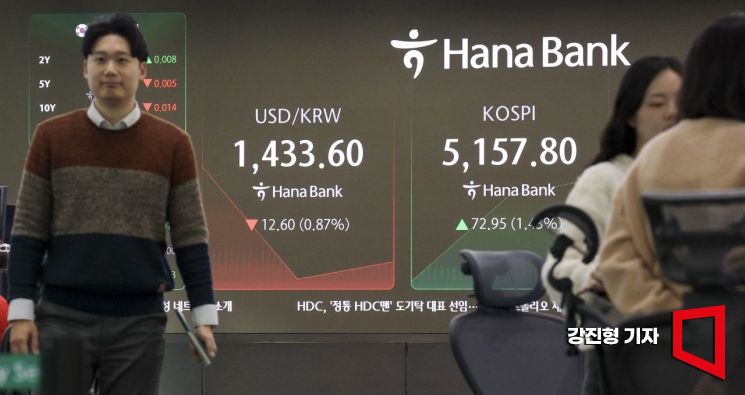 코스피 지수가 장중 사상 첫 5100선을 돌파한 28일 서울 중구 하나은행 딜링룸에서 딜러들이 업무를 보고 있다. 이날 코스닥 지수는 장중 1100선을 돌파 했으며, 원달러 환율은 전 거래일 대비 15.2원 내린 1431원에 거래를 시작 했다.