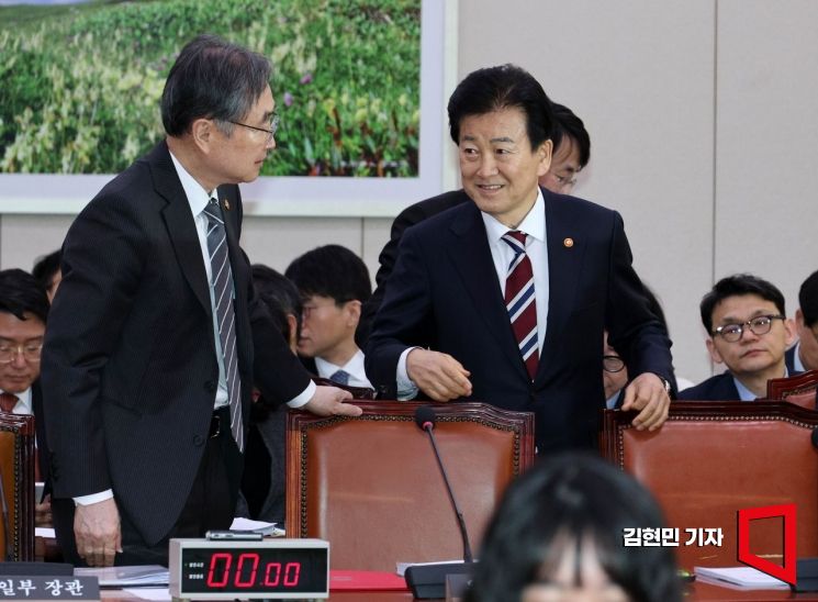 조현 외교부 장관과 정동영 통일부 장관이 28일 국회 외교통일위원회에서 열린 현안질의에 참석하고 있다.