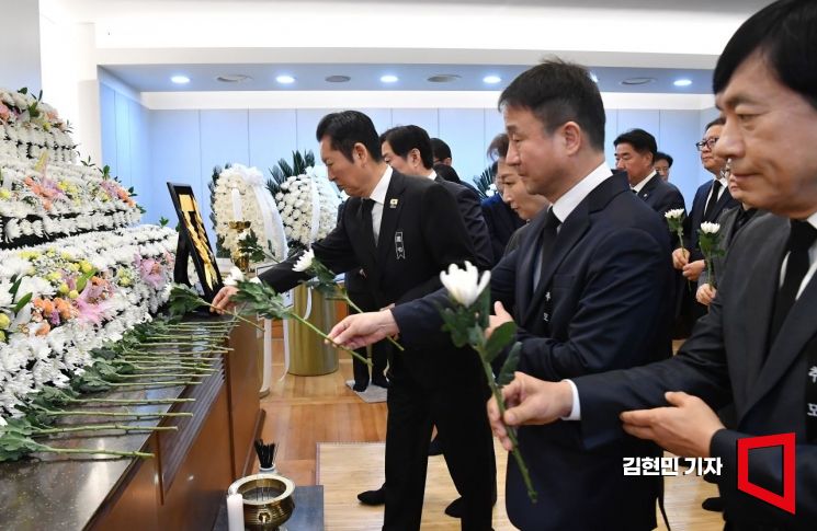 더불어민주당 정청래 대표와 한병도 원내대표, 최고위원들이 28일 서울 종로구 서울대학교병원 장례식장에 마련된 故 이해찬 전 국무총리의 빈소에서 조문을 하고 있다.