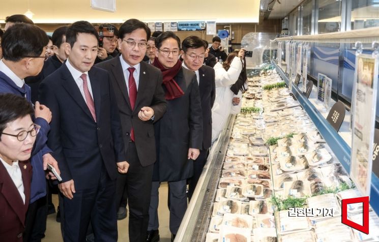 설 명절 맞이 물가점검 현장방문에 나선 장동혁 국민의힘 대표가 28일 오후 서울 서초구 하나로마트 양재점 수산물 코너에서 관계자의 설명을 들으며 이동하고 있다.