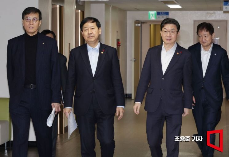 구윤철 경제부총리 겸 재정경제부 장관 등 경제수장들이 29일 서울 종로구 정부서울청사에서 열린 확대거시경제금융회의에서 참석 하고 있다. 오른쪽부터 이찬진 금감원장, 이억원 금융위원장, 구윤철 부총리, 이창용 한국은행 총재.