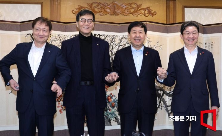 구윤철 부총리 겸 재정경제부 장관 등 경제수장들이 29일 서울 종로구 정부서울청사에서 열린 확대거시경제금융회의에서 참석해 기념 촬영을 하고 있다. 왼쪽부터 이찬진 금감원장, 이창용 한국은행 총재, 구 부총리, 이억원 금융위원장.