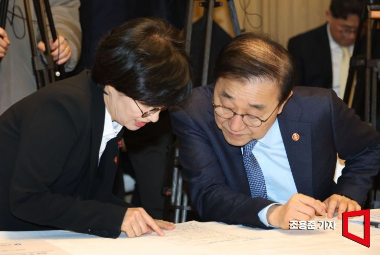 김윤덕 국토교통부 장관(오른쪽)과 원민경 성평등가족부 장관이 29일 서울 종로구 정부서울청사에서 열린 주택공급촉진 관계장관회의에 참석해 대화를 하고 있다.