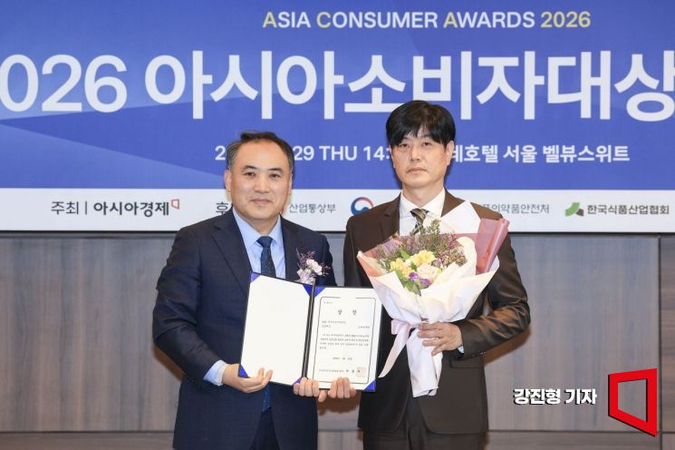 정운호 OB맥주 이사가 29일 서울 중구 롯데호텔에서 열린 '2026 아시아소비자대상 시상식'에 참석해 한국주류산업협회장상을 수상하고 있다.