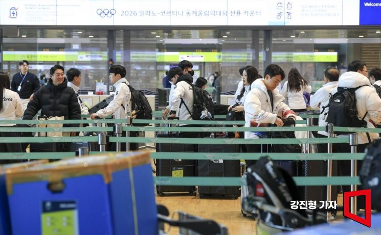 제25회 2026 밀라노·코르티나담페초 동계올림픽에 참가하는 쇼트트랙과 스피드스케이팅 선수단이 30일 인천국제공항 제2여객터미널에서 밀라노로 출국하기 위해 이동하고 있다.