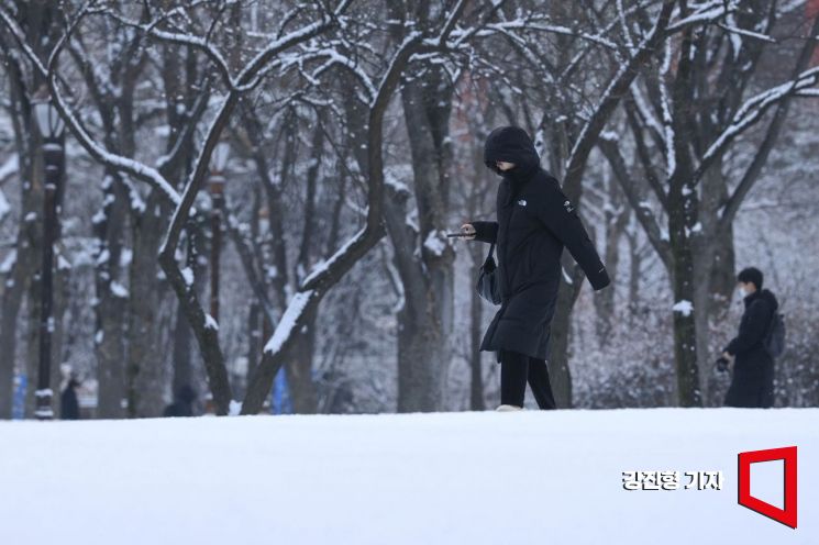 전국 곳곳에 눈이 내린 2일 서울 여의도에서 직장인들이 눈을 밟으며 출근길에 오르고 있다.