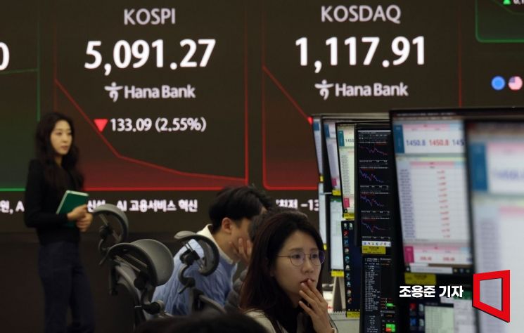 코스피가 장 초반 2% 넘게 하락 출발한 2일 서울 중구 하나은행 본점 딜링룸에서 직원이 증시와 환율 등을 모니터하고 있다. 이날 코스피 지수는 전장 대비 101.74포인트(1.95%) 내린 5,122.62로 출발해 낙폭을 줄이고 있다. 코스닥은 32.27포인트(2.81%) 떨어진 1,117.17, 원/달러 환율은 11.5원 오른 1,451.0원으로 시작했다.