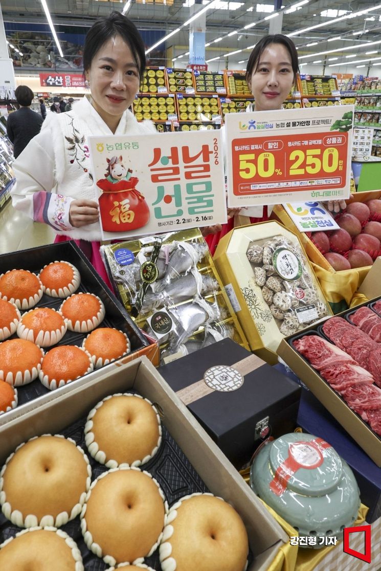 2일 서울 서초구 농협 하나로마트 양재점에서 직원들이 설 선물 세트를 선보이고 있다. 농협유통은 오늘부터 오는 16일까지 설 선물세트를 본격 판매한다. 명품과일, 명품 한우 등 VIP를 위한 고품질 상품부터 5만원 이하의 실속 선물 세트까지 고객이 원하는 모든 설 선물 세트를 준비했다.