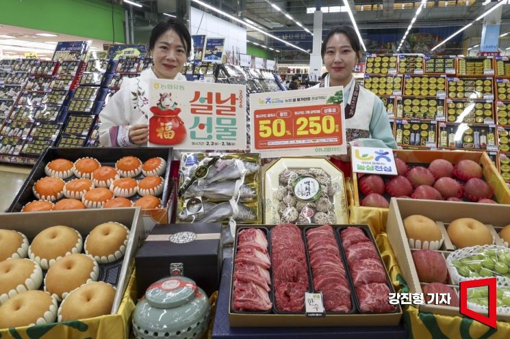 2일 서울 서초구 농협 하나로마트 양재점에서 직원들이 설 선물 세트를 선보이고 있다. 농협유통은 오늘부터 오는 16일까지 설 선물세트를 본격 판매한다. 명품과일, 명품 한우 등 VIP를 위한 고품질 상품부터 5만원 이하의 실속 선물 세트까지 고객이 원하는 모든 설 선물 세트를 준비했다.